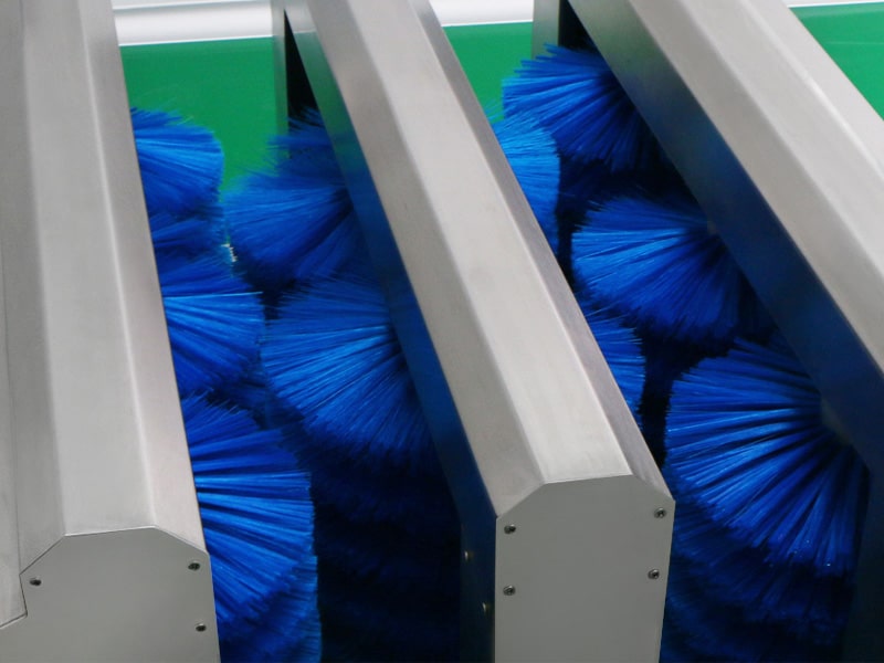 Boots are scrubbed by rotating brushes, rinsed with water, disinfected with mist, and dried—all in one pass.